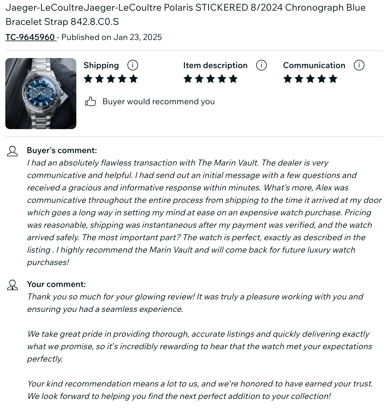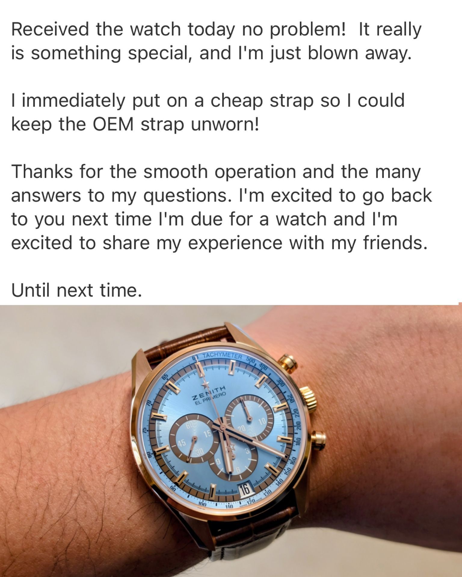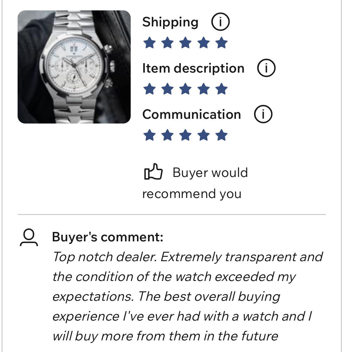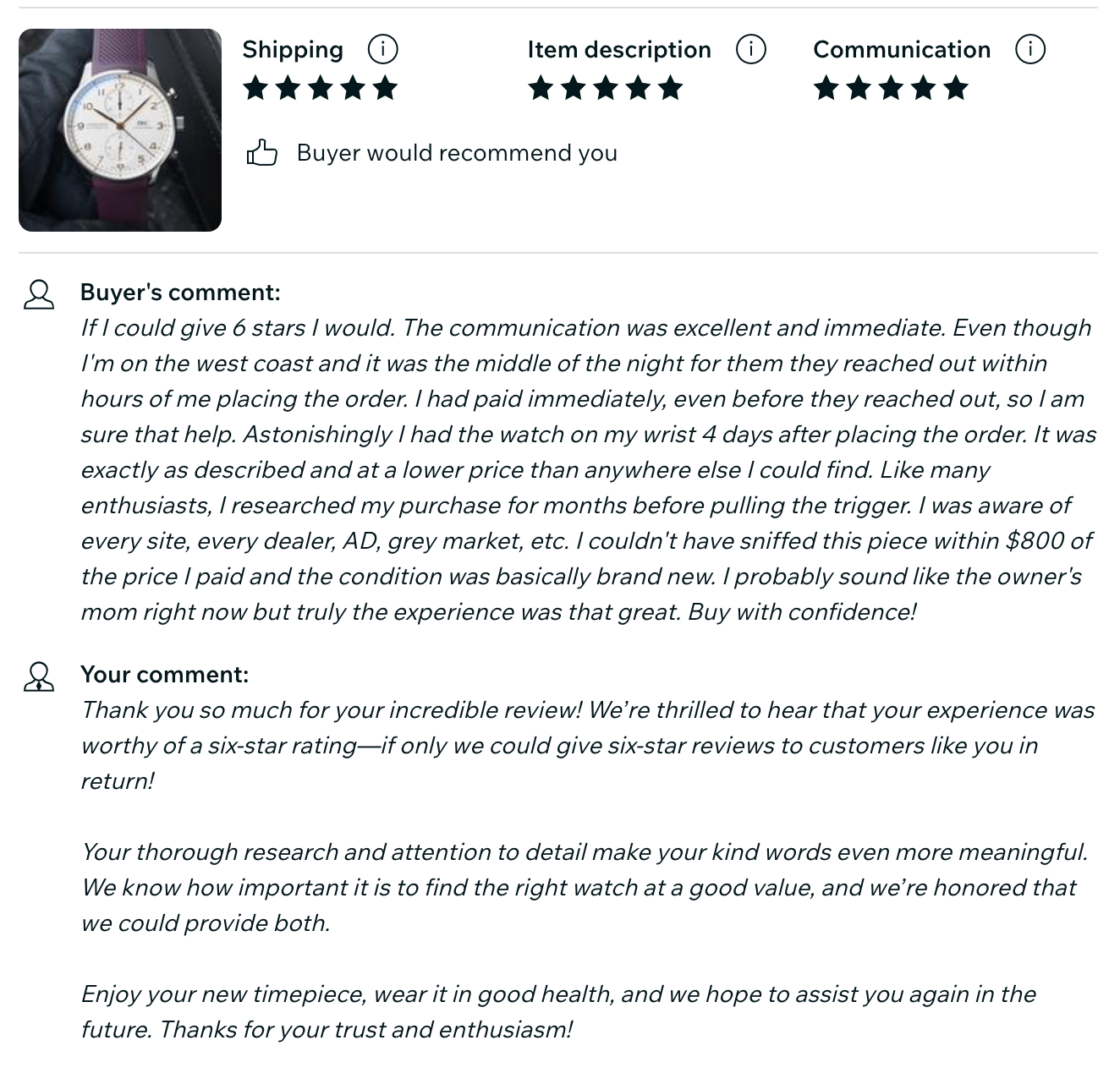 We maintain a 5 Star rating on Ebay, Google, Chrono24, and through social media. See what our customers have to say:
